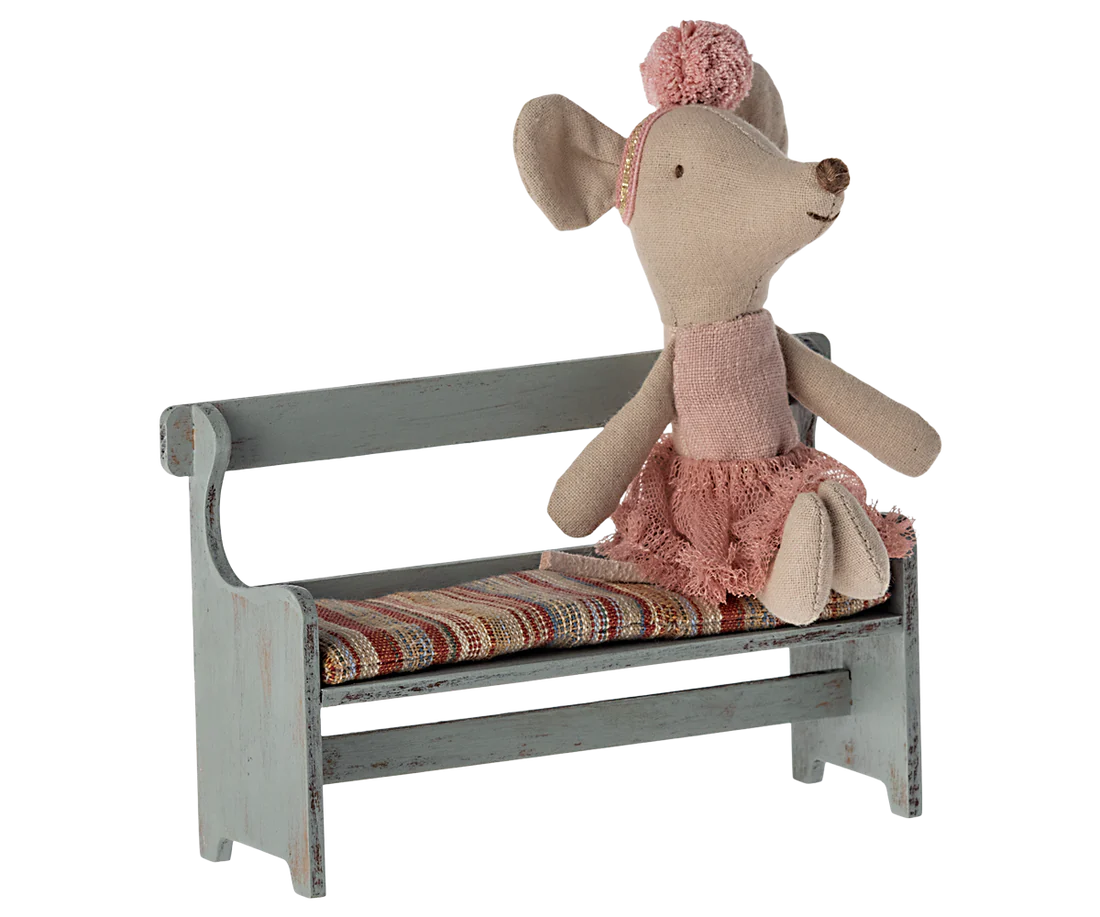 O banco de madeira feito para sentar toda a família dos ratinhos. Pintado à mão, com um visual vintage e uma almofada macia no assento para mais conforto (ratinho não incluído)
