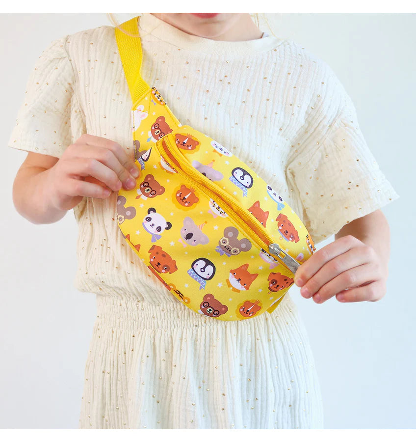 Bolsa de cintura infantil com alça ajustável que também pode ser usada ao peito. Uma carteira e o telemóvel cabe perfeitamente no compartimento frontal, tem também um bolso na parte de trás com fecho de correr, ideal para pequenos objetos.