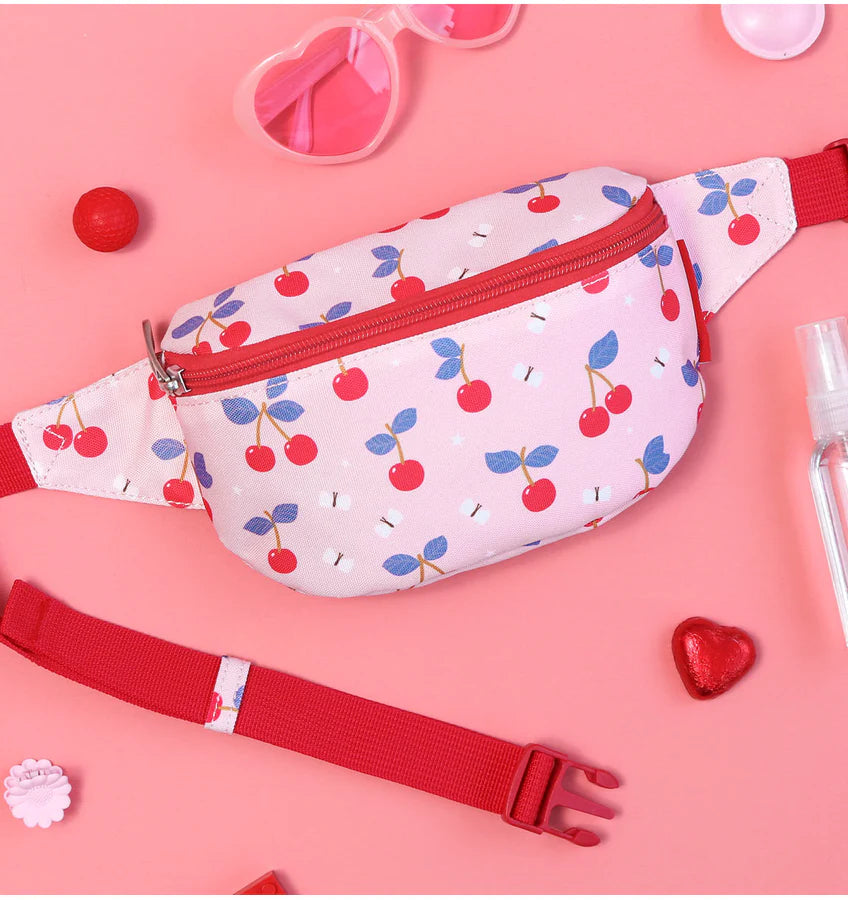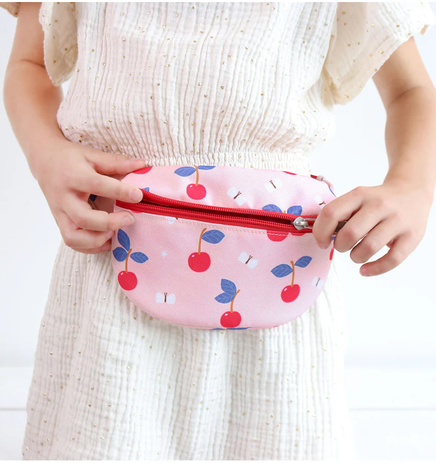 Bolsa de cintura infantil com alça ajustável que também pode ser usada ao peito. Uma carteira e o telemóvel cabe perfeitamente no compartimento frontal, tem também um bolso na parte de trás com fecho de correr, ideal para pequenos objetos.