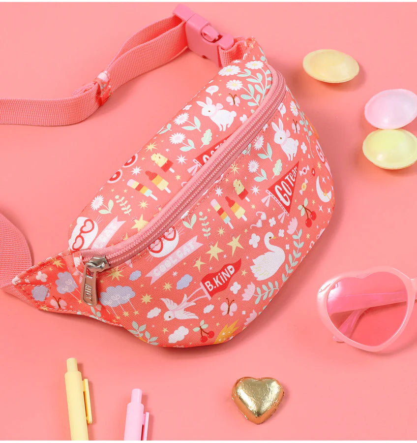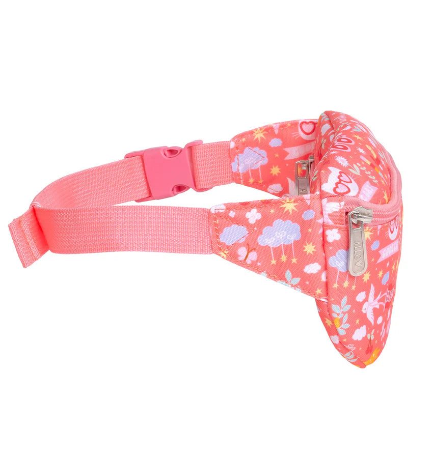 Bolsa de cintura infantil com alça ajustável que também pode ser usada ao peito. Uma carteira e o telemóvel cabe perfeitamente no compartimento frontal, tem também um bolso na parte de trás com fecho de correr, ideal para pequenos objetos.