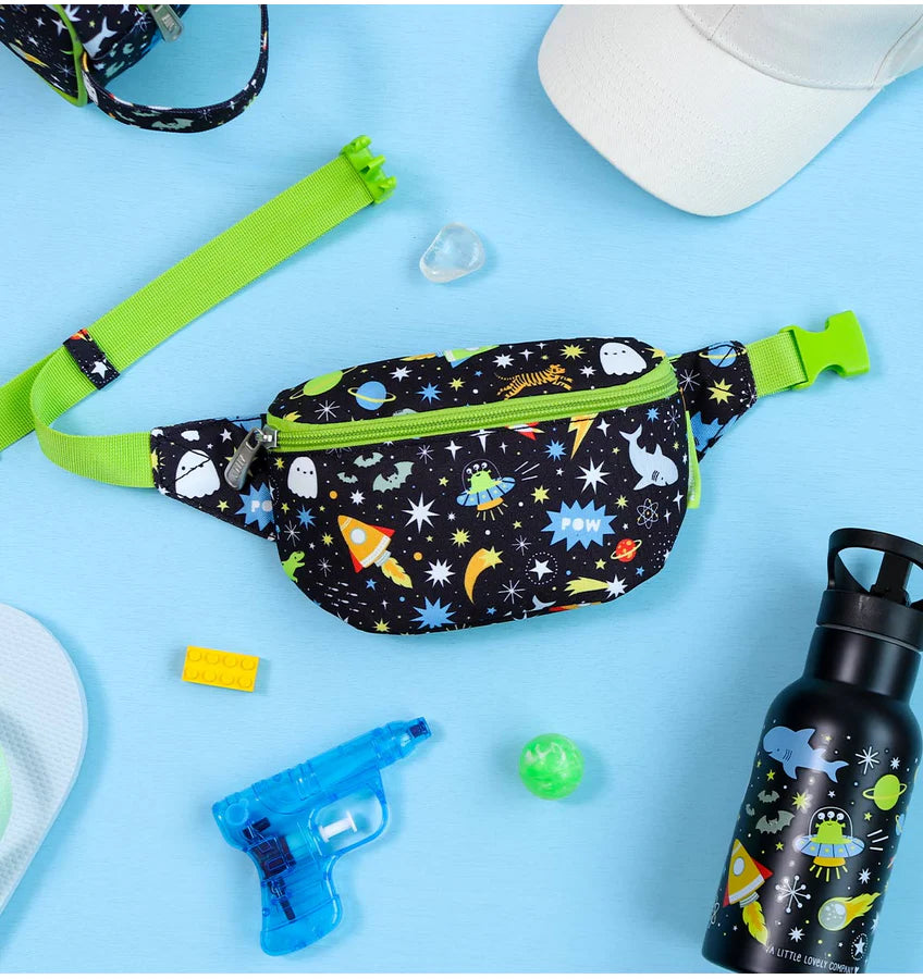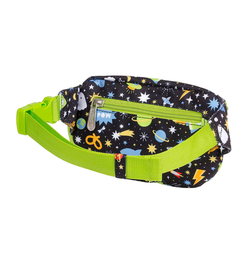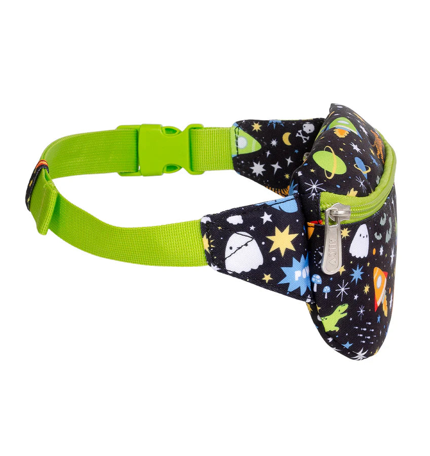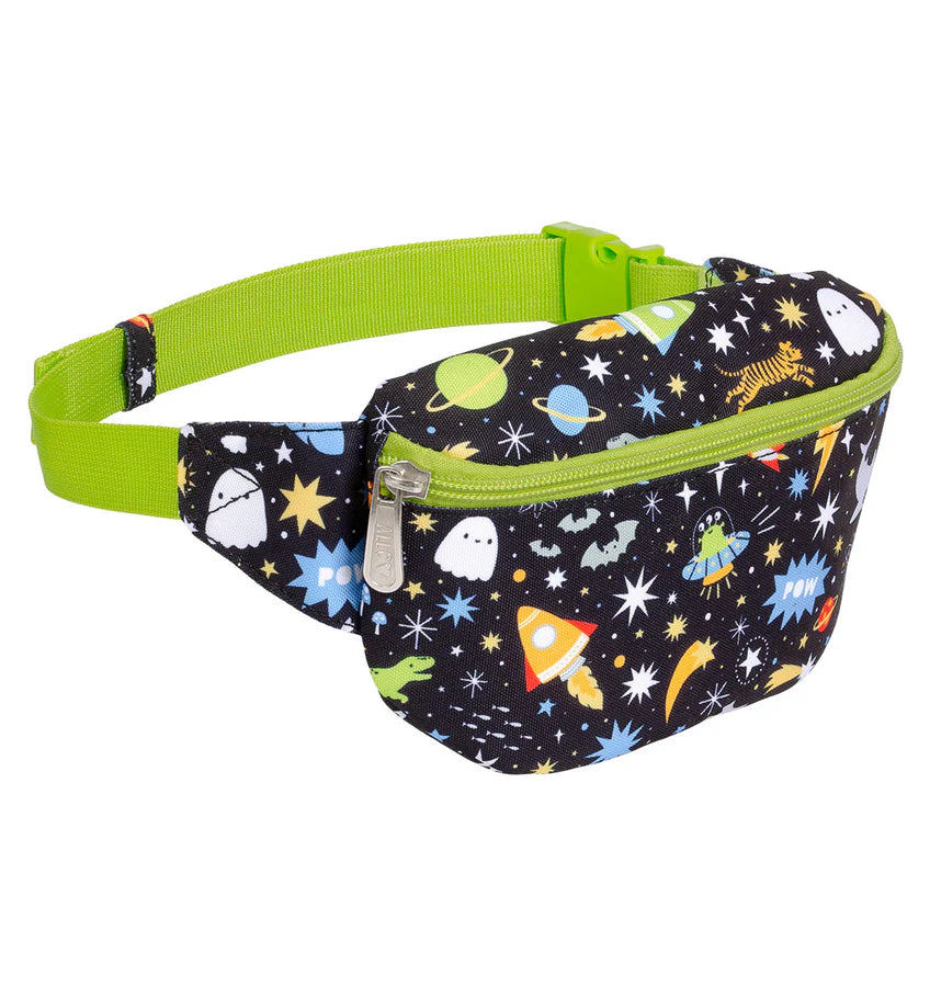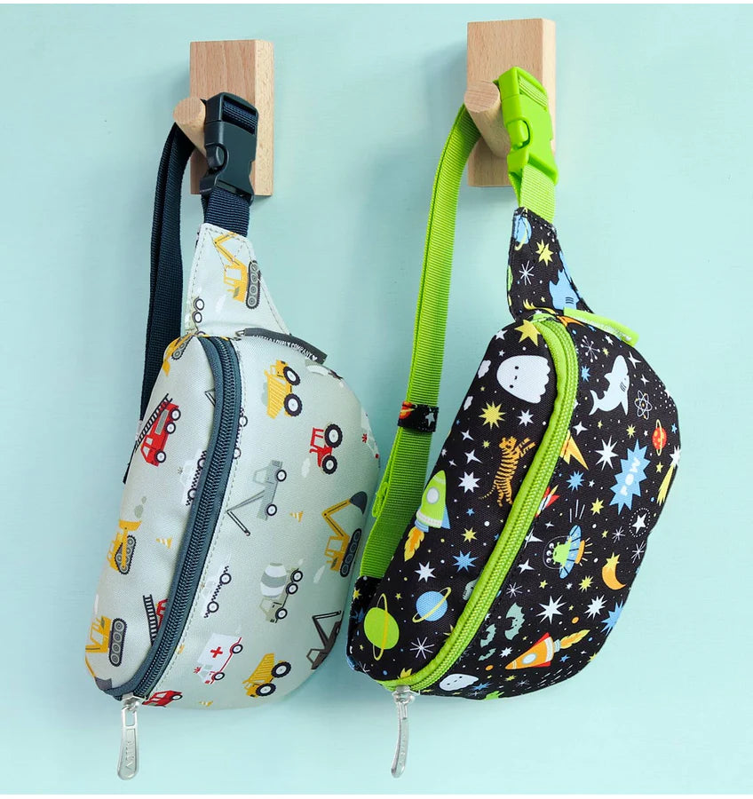 Bolsa de cintura infantil com alça ajustável que também pode ser usada ao peito. Uma carteira e o telemóvel cabe perfeitamente no compartimento frontal, tem também um bolso na parte de trás com fecho de correr, ideal para pequenos objetos.