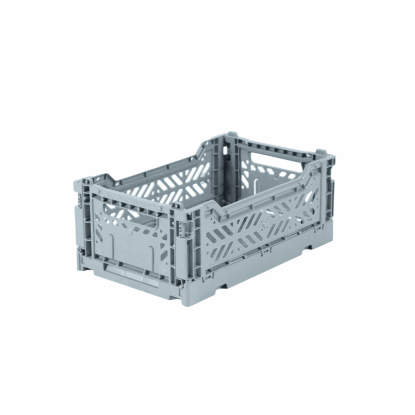 Caixa com pegas empilhável. Painéis amovíveis para fácil limpeza.