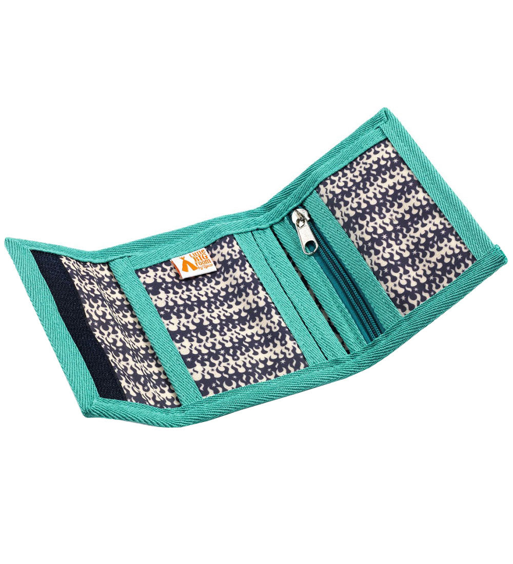 A carteira tem um formato quadrado e fecho em velcro. Ao abrir, revela um amplo bolso lateral, ideal para guardar dinheiro, por exemplo. Numa das extremidades, existe um bolso exterior com fecho, e no centro, dois bolsos laterais.