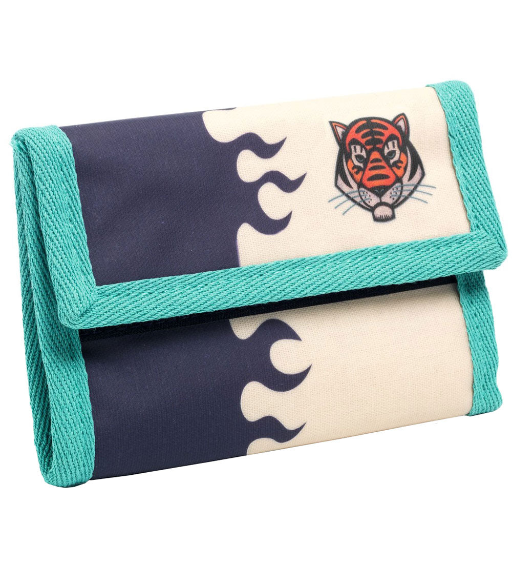 Carteira moderna em branco e azul-marinho com estampado de chamas e detalhes em verde-turquesa. Uma estampa de tigre laranja adorna uma das laterais.