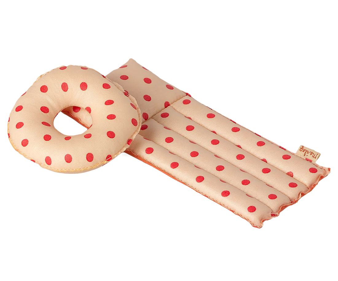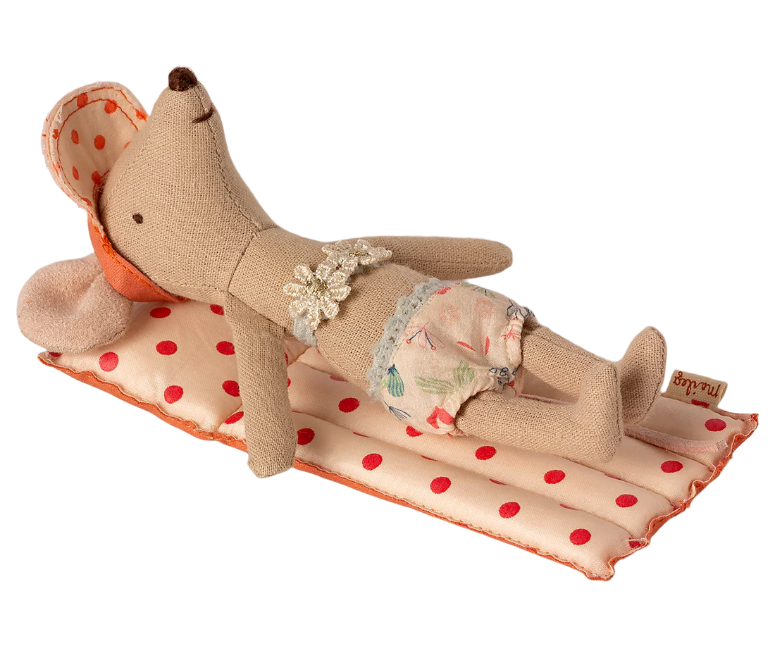 Tempo de férias! Um colchão de praia feito de tecido revestido para um visual mais autêntico, não é à prova de água, apenas na tua imaginação flutua na água. Neste colchão cabem todos os ratinhos até ao tamanho mum/dad. (ratinho e boia não incluídos)