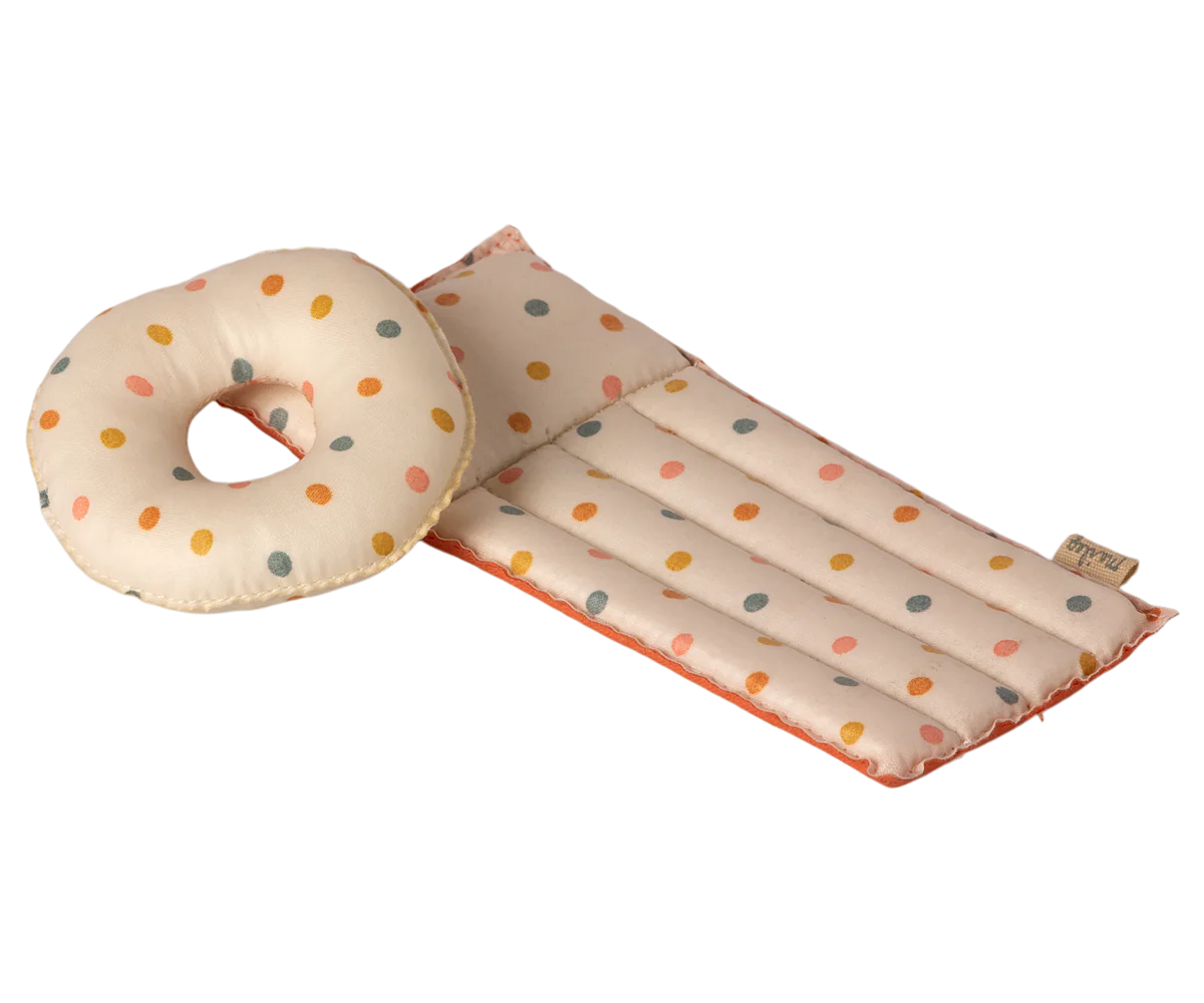 Tempo de férias! Um colchão de praia feito de tecido revestido para um visual mais autêntico, não é à prova de água, apenas na tua imaginação flutua na água. Neste colchão cabem todos os ratinhos até ao tamanho mum/dad. (ratinho e boia não incluídos)