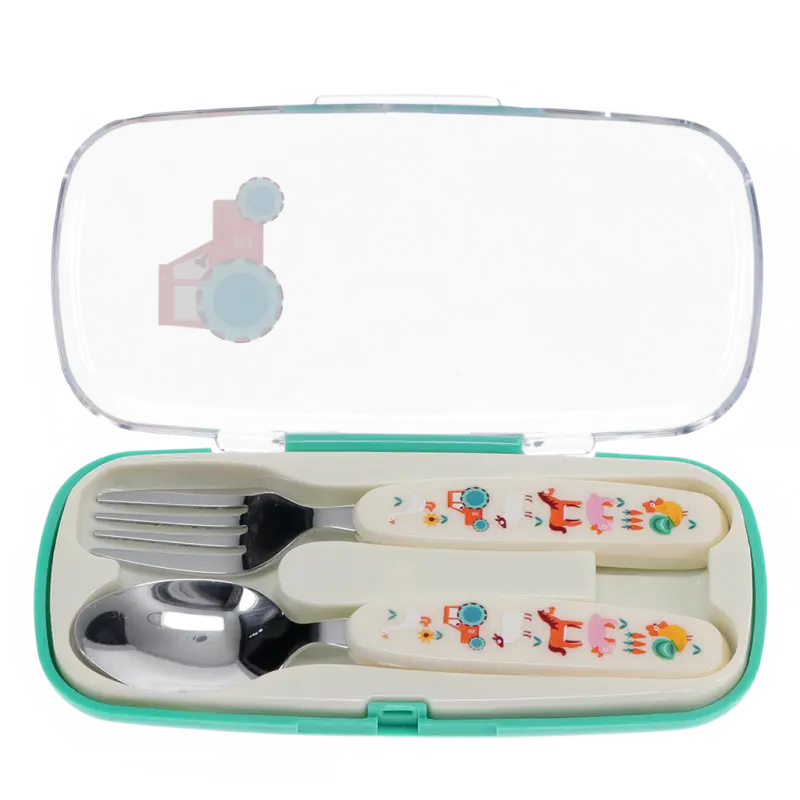 Conjunto de colher e garfo para crianças com caixa para guardar e transportar