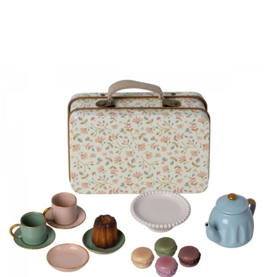 Este conjunto é perfeito para os teus amigos ratinho, com todos os elementos necessários para uma tarde aconchegante de chá e bolinhos. Vem embalado na mítica malinha de metal, com um padrão clássico Maileg