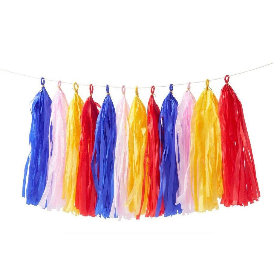 Dê um toque de cor extra à sua celebração com esta bela guirlanda de papels, com borlas ousadas e brilhantes em azul, vermelho, amarelo e rosa. Perfeito para qualquer festa, as borlas são suspensas em cordão de marfim.