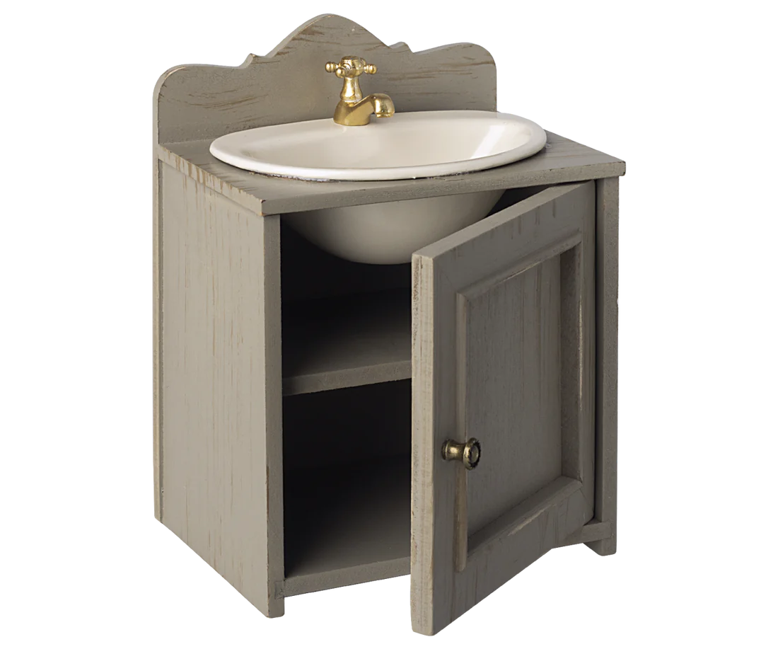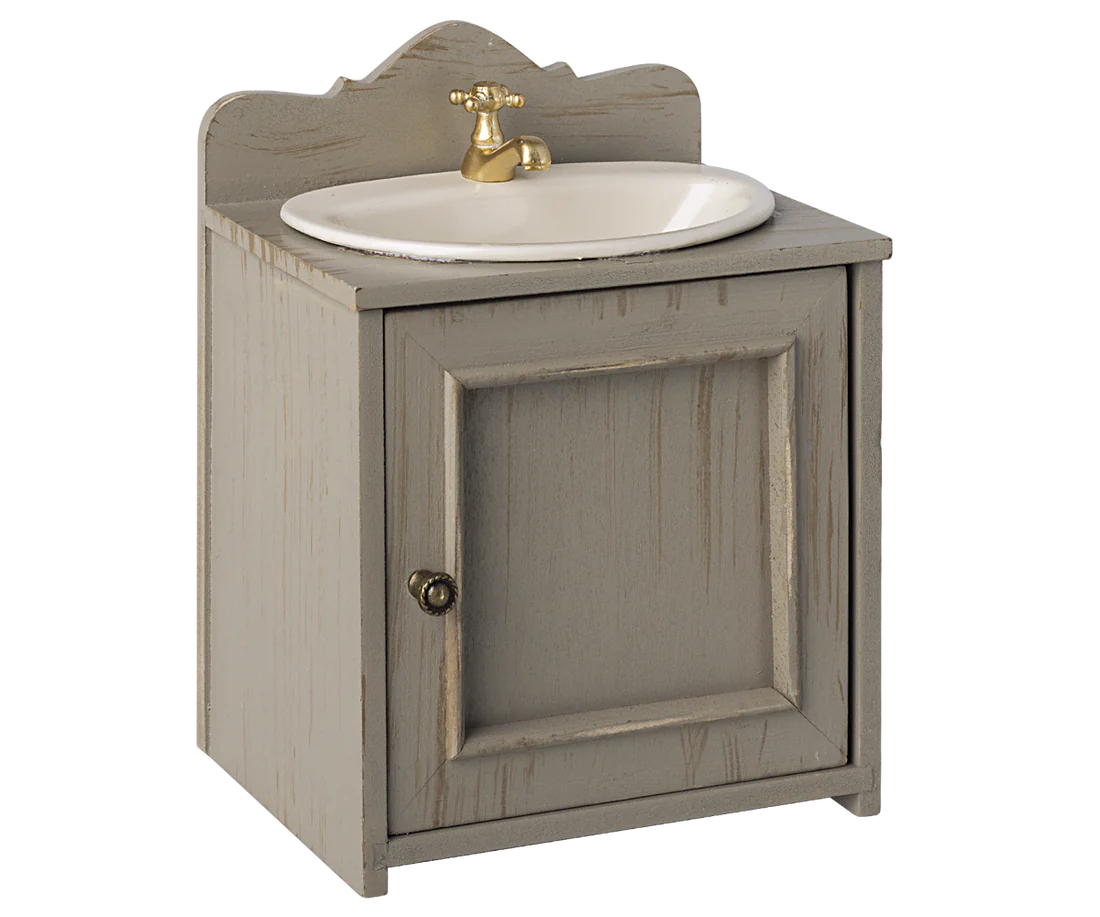 Um elegante lavatório de metal vintage com uma charmosa torneira dourada. Este lavatório está integrado num armário de madeira, decorado com belos detalhes pintados à mão, que realçam o seu estilo vintage e completam na perfeição o ambiente clássico