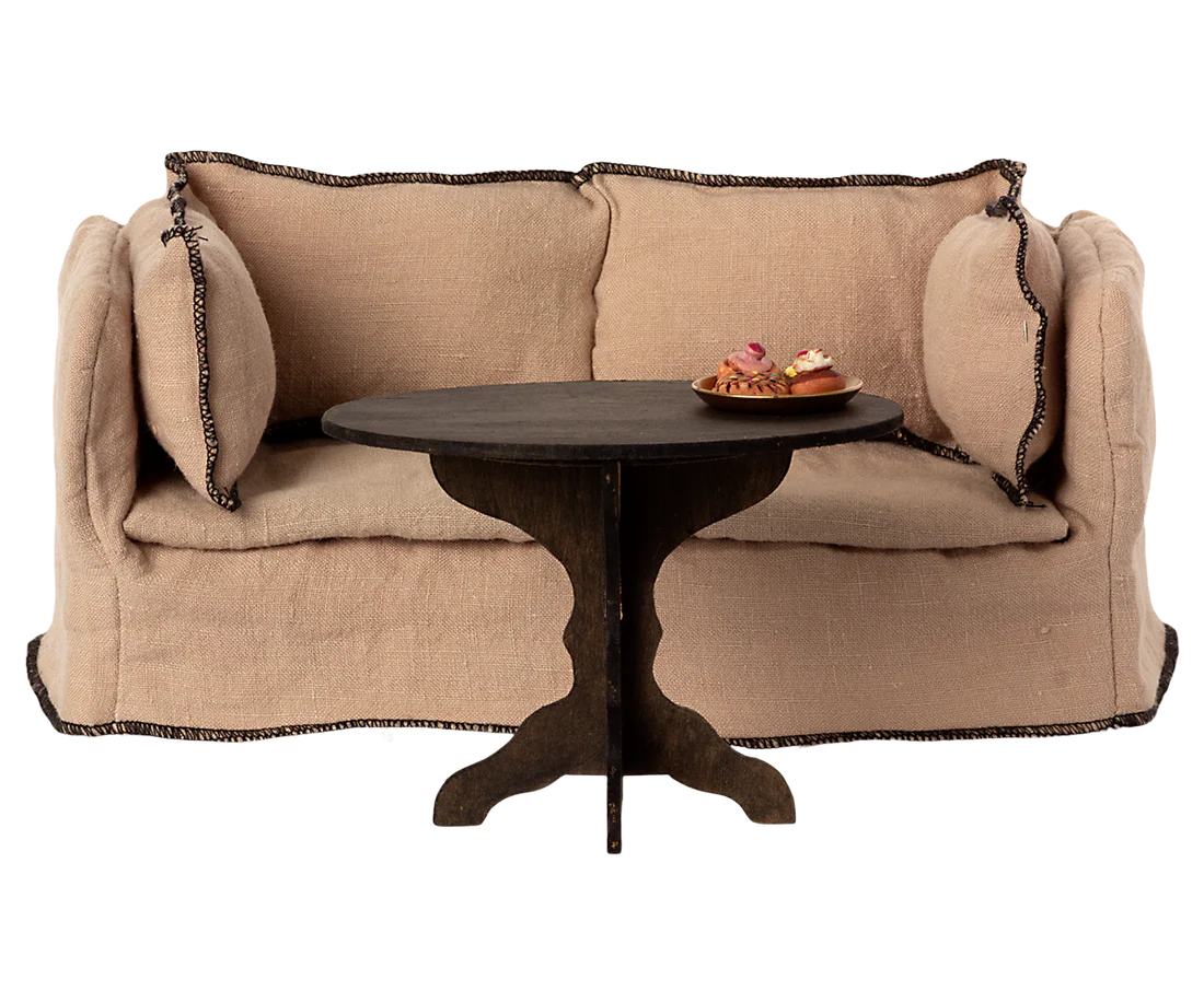 A mesa de centro apresenta uma elegante cor antracite que combina perfeitamente com o sofá e a casa de bonecas Maileg. Fácil de montar e cuidadosamente embalada, esta mesa está pronta para que a diversão comece num instante.