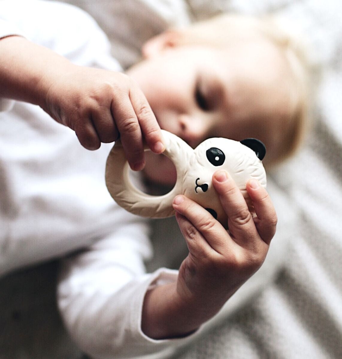 Brinquedo ecológico suave e fácil de segurar. Estimula os sentidos do bebé e acalma as gengivas.