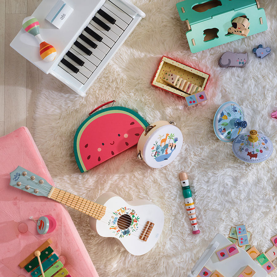 Estes brinquedos também são projetados para diferentes paixões. Descubra esta pandeireta de madeira, delicadamente ilustrada pela artista Sarah Betz-Cubeely, que convidará o seu pequeno a uma jornada musical e visual repleta de doçura. Esta pandeireta é muito mais do que um simples instrumento, ela transforma-se num companheiro para a descoberta de sons, estimulando a criatividade e a curiosidade das crianças desde cedo.