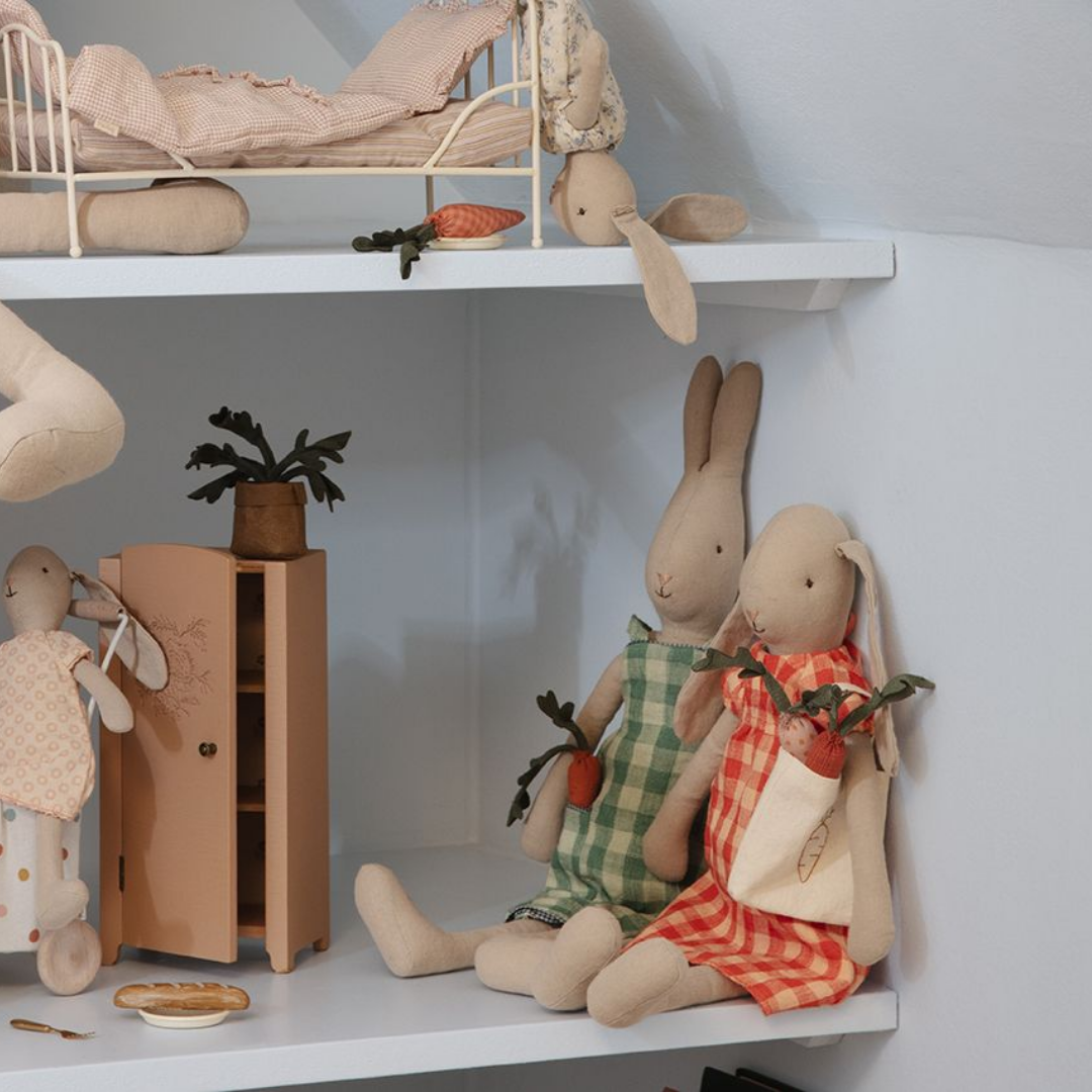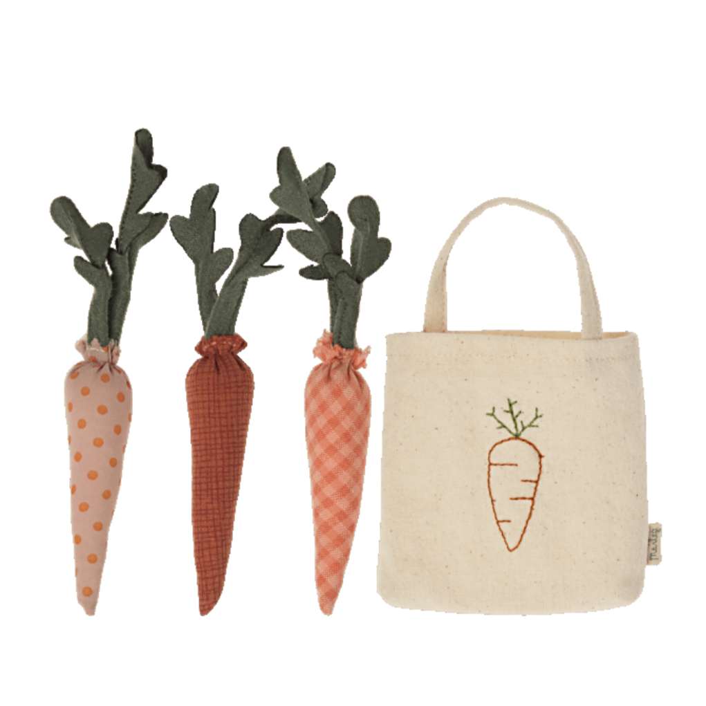 O petisco favorito dos coelhos e coelhinhos. Este pequeno saco contém três cenouras e é todo em tecido Maileg. Um acessório amoroso que traz ainda mais brincadeiras.