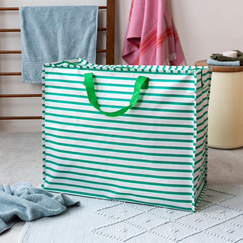 Esta saco com riscas verde é elegante e prático, perfeito para manter a sua casa organizada. Feito de plástico reciclado, armazena de tudo, desde roupa de cama e vestuário a brinquedos e roupa suja. Seja para uma mudança, para ajudar os filhos a ir para a universidade ou simplesmente para encontrar uma solução de arrumação inteligente, este é o saco ideal!